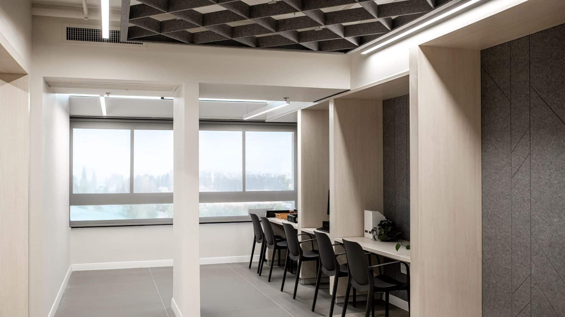 תקרת Grid PET – תקרת אריחים גאומטריים, שיוצרים אפקט תלת־ממדי משתנה בהתאם לתאורה. התקרה מוסיפה עומק חזותי, שומרת על קו מינימליסטי, ומספקת רמת ספיגה גבוהה של רעשי רקע.