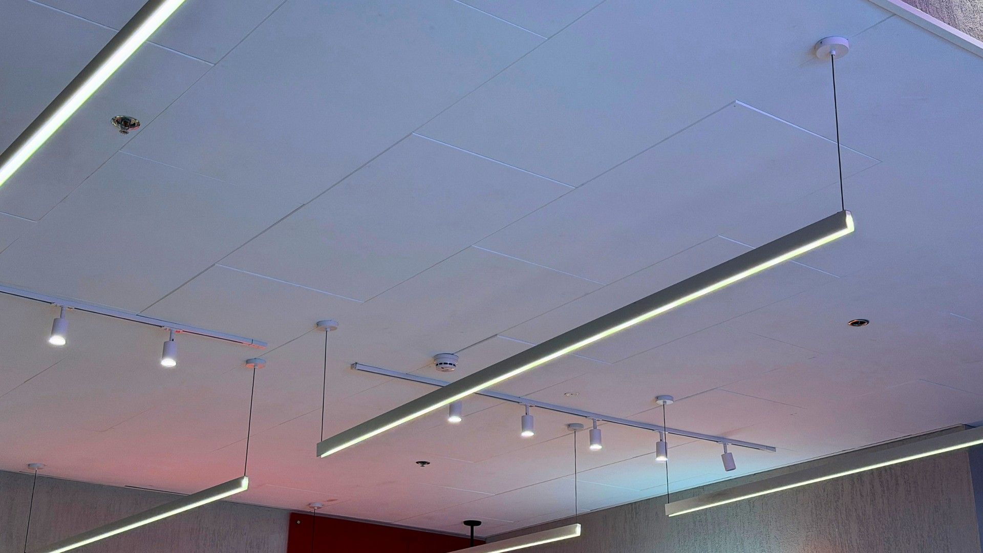 האריחים הודבקו ישירות לתקרה שמעל הרשת, ויוצרים פתרון אקוסטי אפקטיבי מבלי לפגוע במראה הפתוח והדרמטי של התקרה.