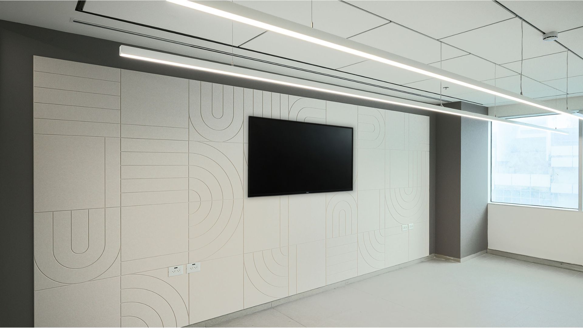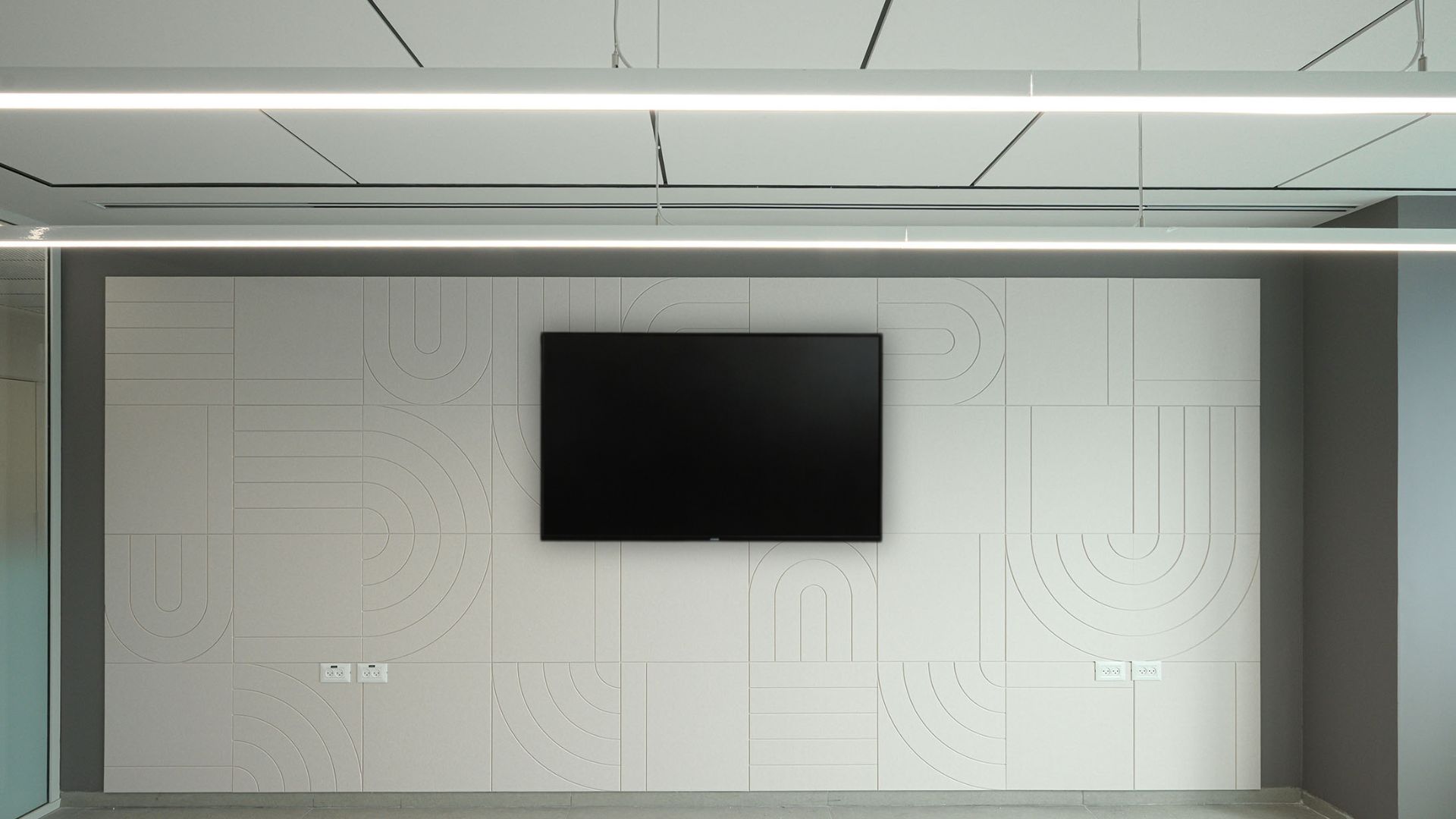 בחדר ההדרכה נבחר שילוב בין תקרת צמר אקוסטית חצי נסתרת ניטובו DG, לבין חיפוי קירPET מחורץ Groove מבית ECOPET.
