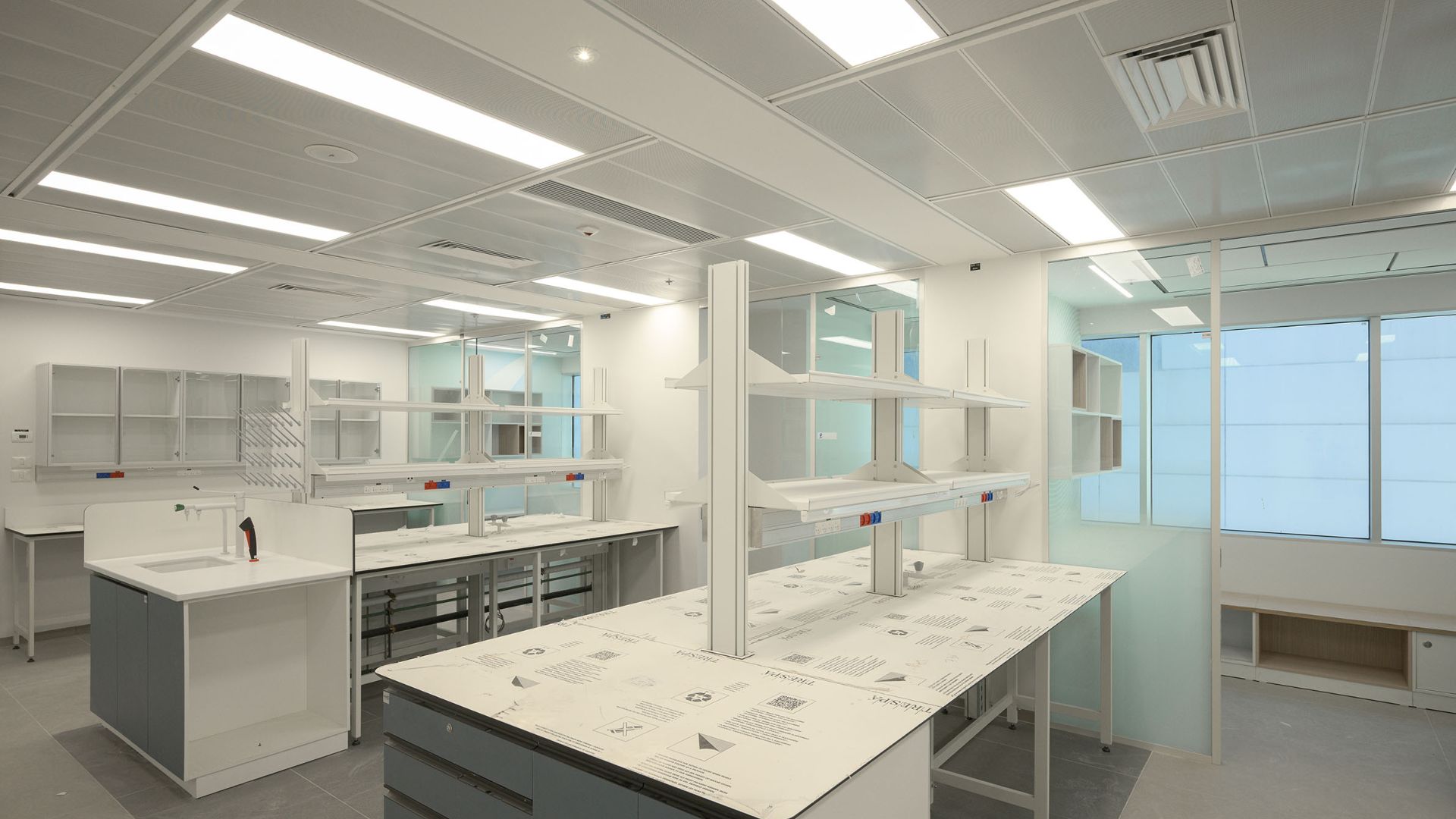 במעבדות נבחרה תקרת מגשי מתכת מחוררים מתוצרת Hecht & Efraim, המשלבות נגישות נוחה למערכות העוברות מעל עם גמישות תכנונית רחבה. המגשים מיוצרים בהתאמה לאורך ולרוחב הנדרשים, ומאפשרים פירוק קל ונוח לצורכי תחזוקה. בשילוב גיזה אקוסטית ROYALIN מתקבלים ביצועים אקוסטיים של עד NRC 0.8, לצד עמידות גבוהה המתאימה לסביבה מעבדתית אינטנסיבית.