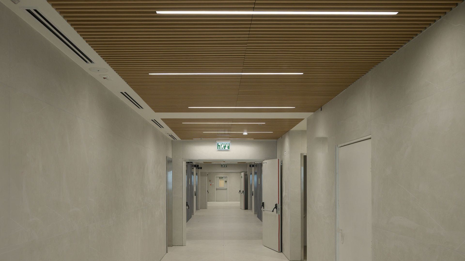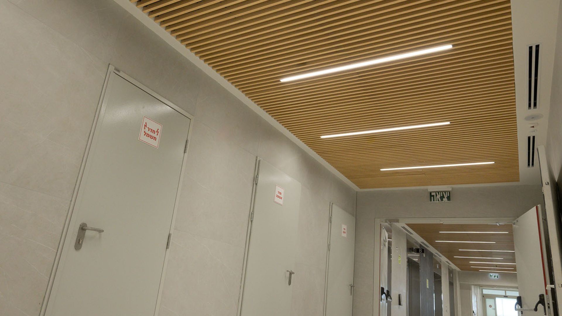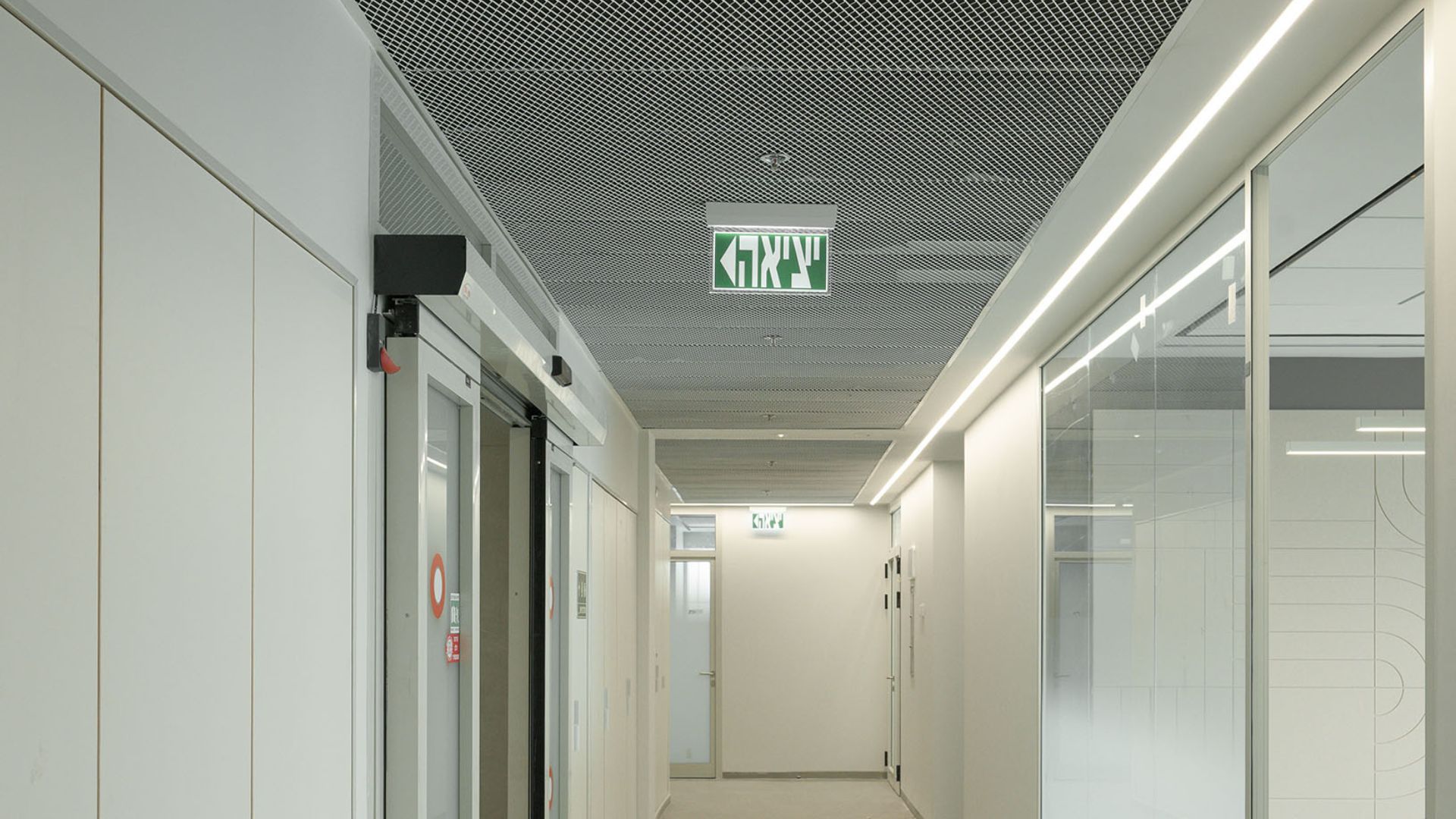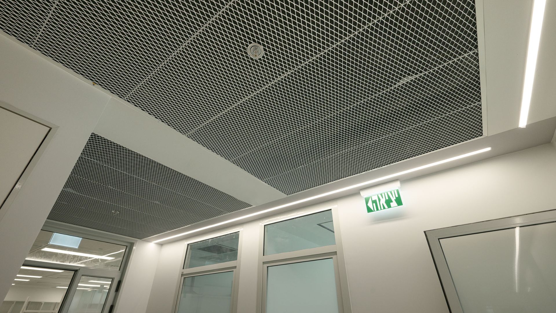 במסדרונות ובמעברים יושמה תקרת רשת אקספנדד בגוון לבן, המעניקה לחלל אופי תעשייתי מודרני ותחושת פתיחות מלאה כלפי המערכות שמעל התקרה. לוחות הרשת, העשויים מתכת מתוחה ומגלוונת, מאפשרים מגוון רחב של דוגמאות ויישומים ומייצרים אפקט תלת־ממדי עדין.