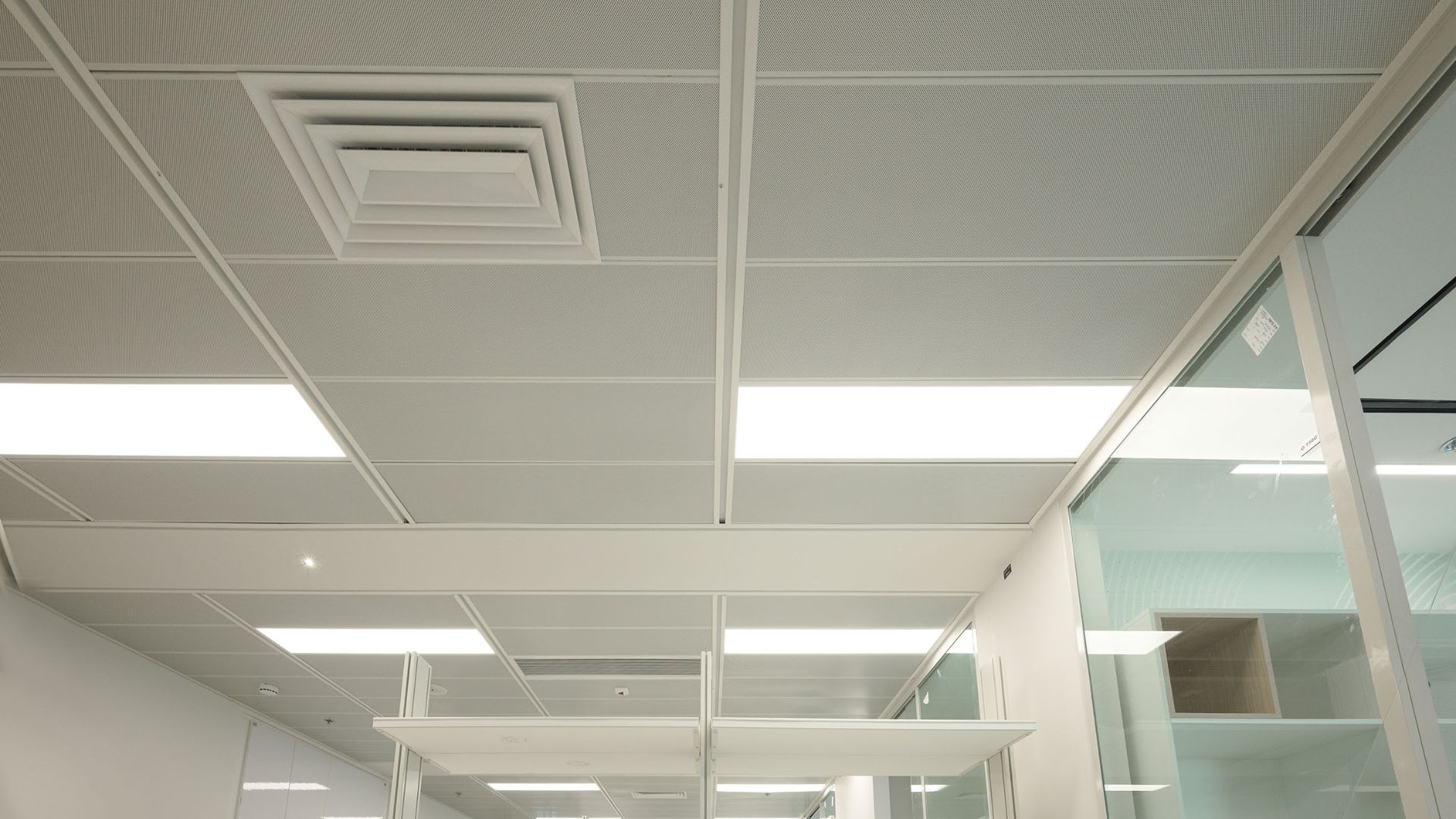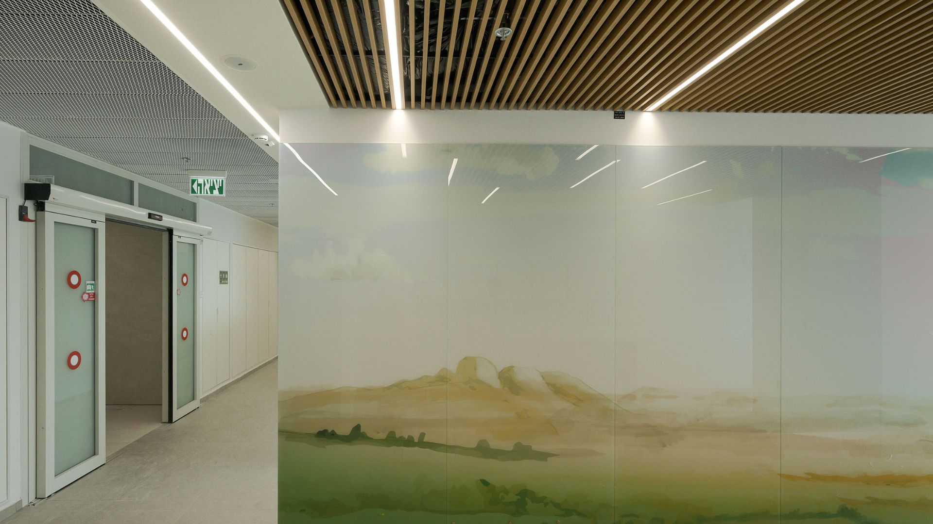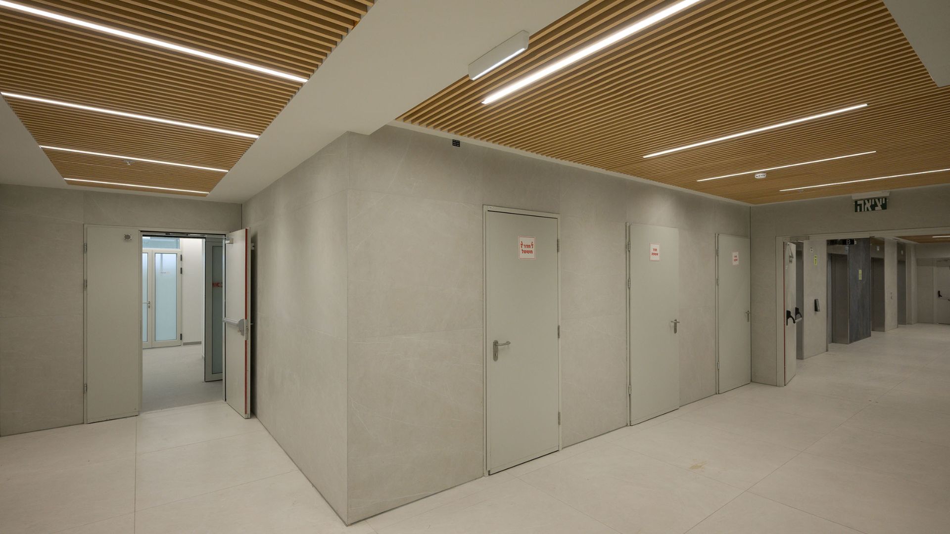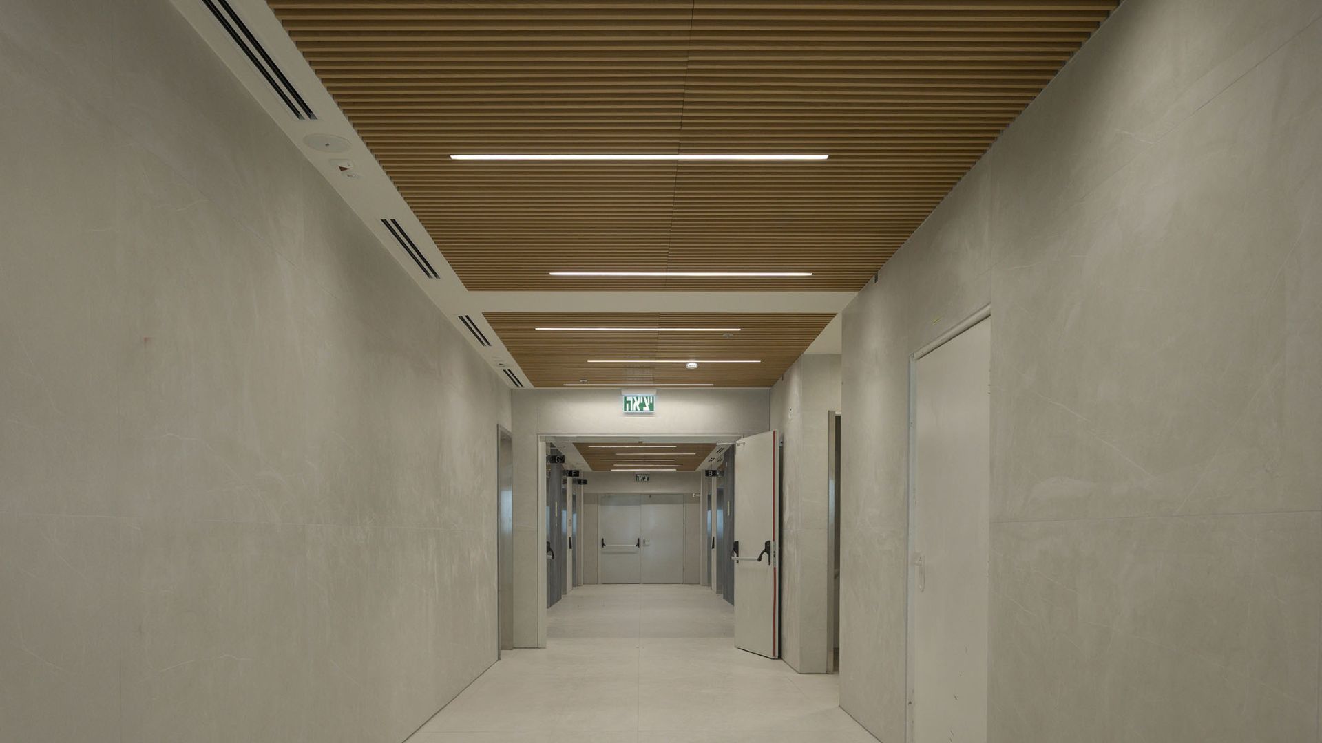 במסדרונות ובמעברים יושמה תקרת רשת אקספנדד בגוון לבן, המעניקה לחלל אופי תעשייתי מודרני ותחושת פתיחות מלאה כלפי המערכות שמעל התקרה. לוחות הרשת, העשויים מתכת מתוחה ומגלוונת, מאפשרים מגוון רחב של דוגמאות ויישומים ומייצרים אפקט תלת־ממדי עדין.