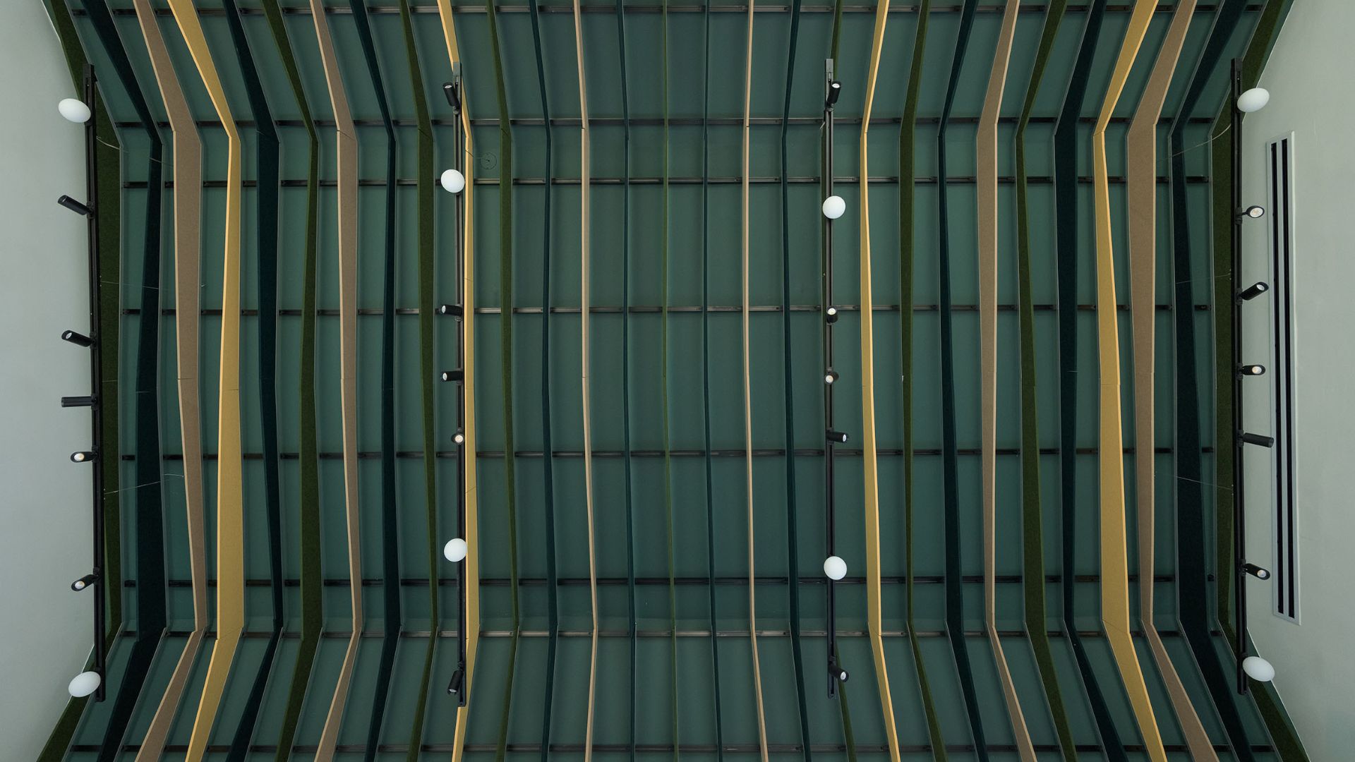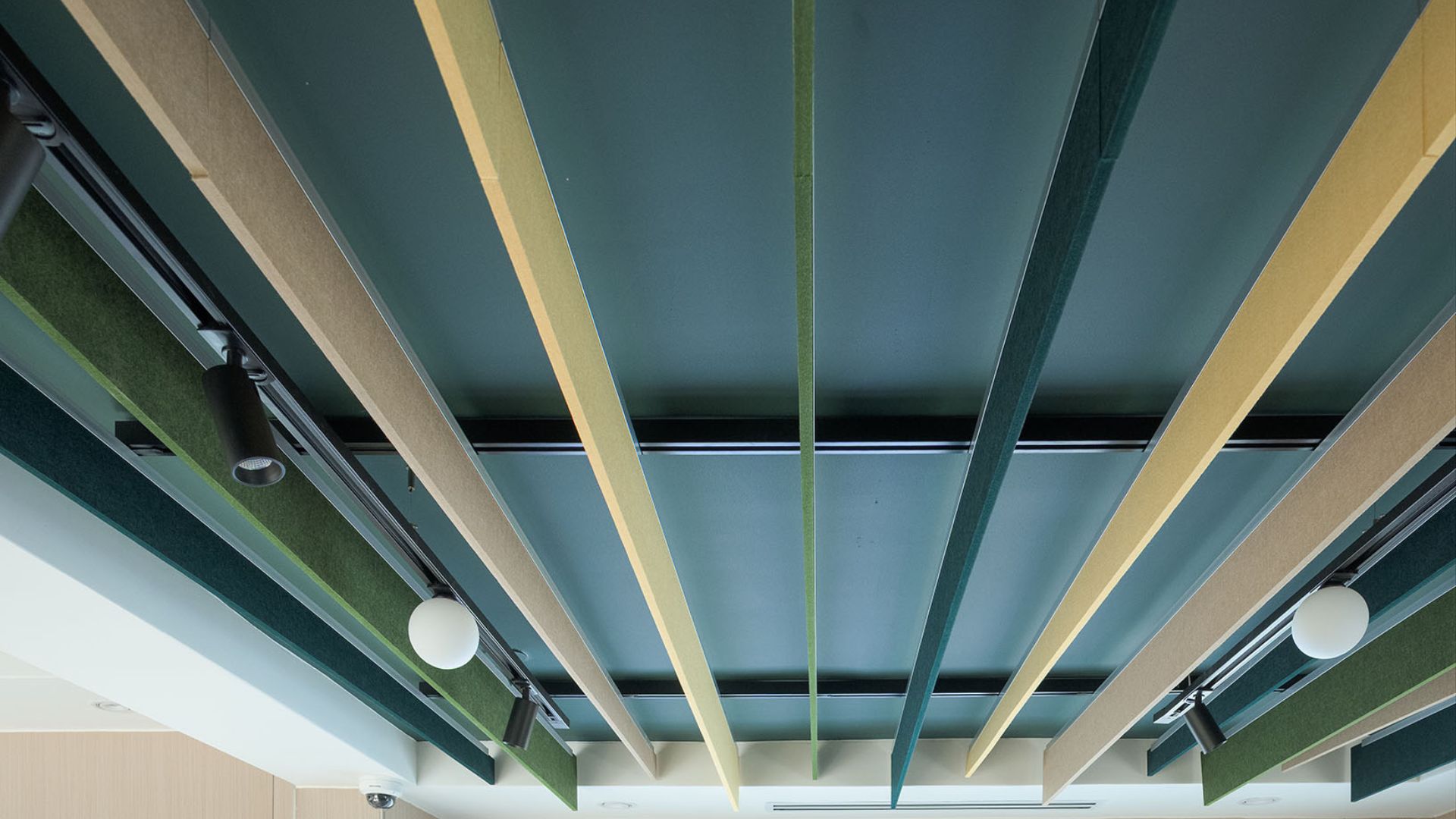 לחלל נבחרו סנפירי Frontier אלמנטי תקרה אנכיים עשויים פוליאסטר ממוחזר (PET), שעוצבו בחיתובים ייחודיים ובגוונים ירוקים בהירים ועמוקים, בהשראת משטחי המגרשים והצמחייה שסביבם.